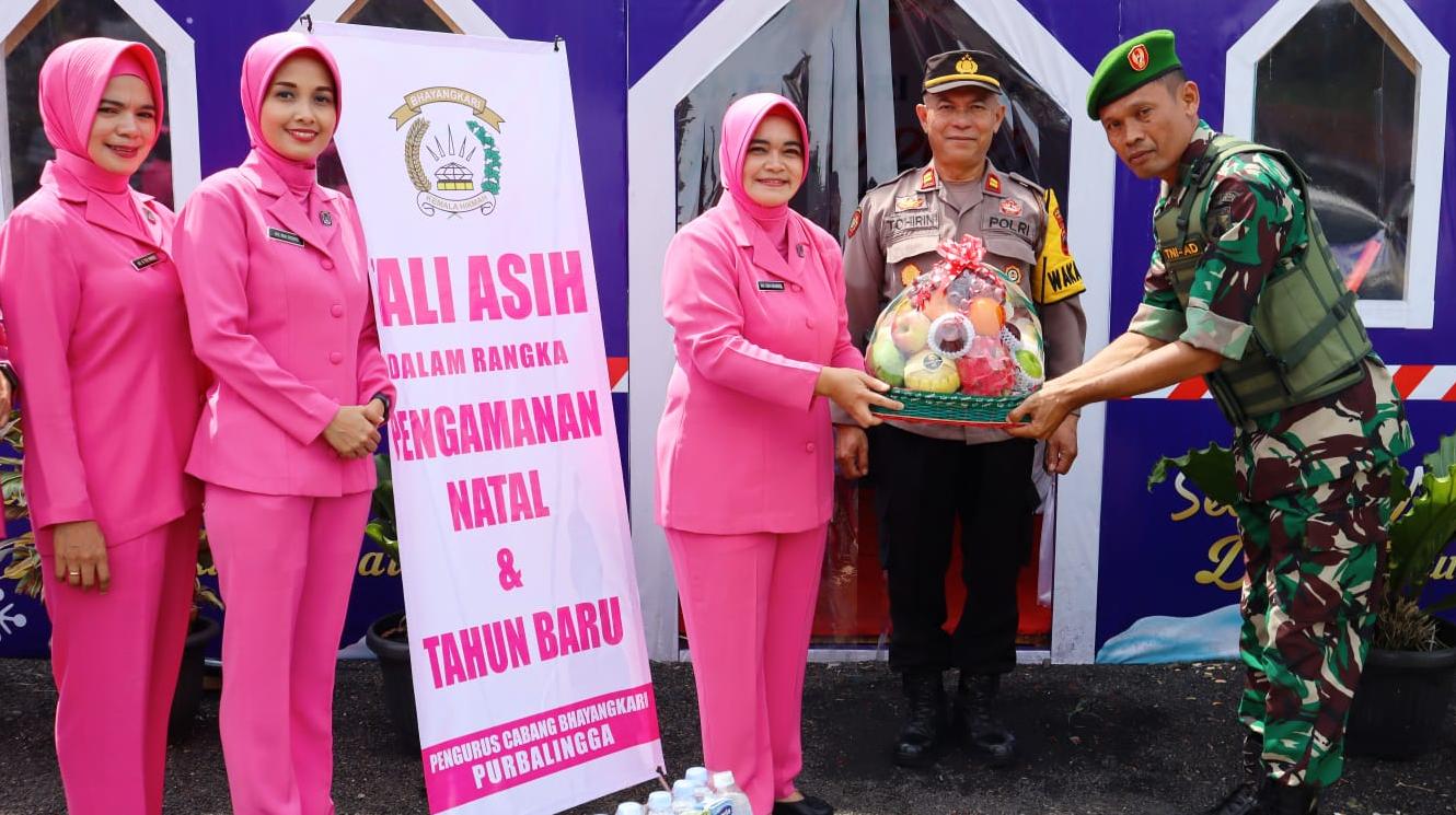 SUARA MEREKA Bhayangkari Cabang Purbalingga memberikan tali asih kepada petugas pengamanan di Pos Pengamanan Operasi Lilin Candi 2023 wilayah Kabupaten Purbalingga, Selasa (26/12/2023).