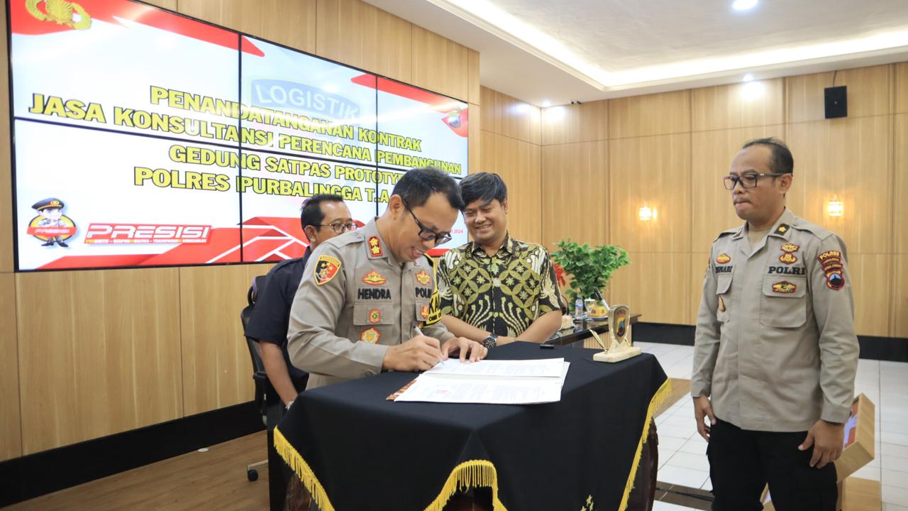Polres Purbalingga melaksanakan penandatanganan kontrak jasa konsultasi rencana pembangunan gedung Satuan Penyelenggara Administrasi SIM (Satpas) Prototipe di Kabupaten Purbalingga. Kegiatan dilaksanakan di Aula Wicaksana Laghawa Mapolres Purbalingga, Kamis (1/2/2024).