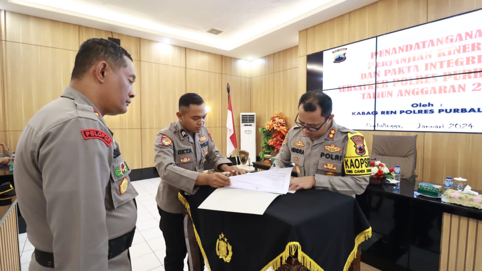 Usai paparan dilanjutkan dengan penandatanganan perjanjian kinerja dan pakta integritas oleh Kapolres Purbalingga dan perwakilan dari masing-masing bagian. Dilakukan penyerahan buku rencana pendistribusian anggaran kepada perwakilan bagian, fungsi dan polsek.