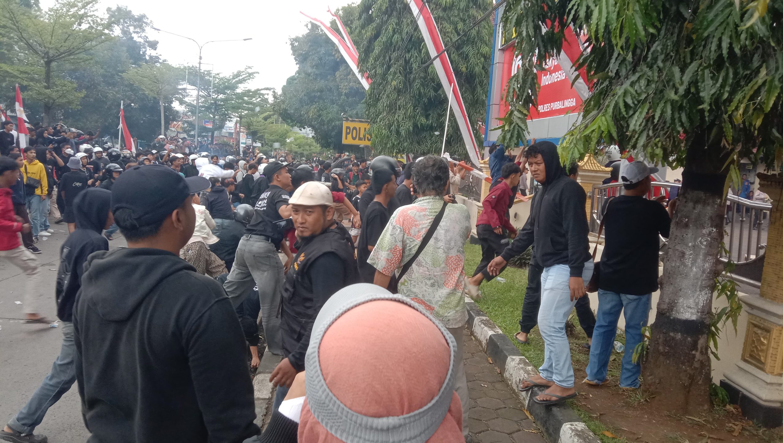 Ratusan massa yang didominasi anak SMP, SMA dan Mahasiswa lari tunggang langgang disaat melakukan aksi di depan Polres purbalingga yang berada di jalan Mayjen Sungkono. gas air mata terpaksa dilepaskan anggota Kepolisian disaat keadaan sudah kian memanas, setelah pendemo melemparkan botol air mineral dan juga batu ke arah aparat.